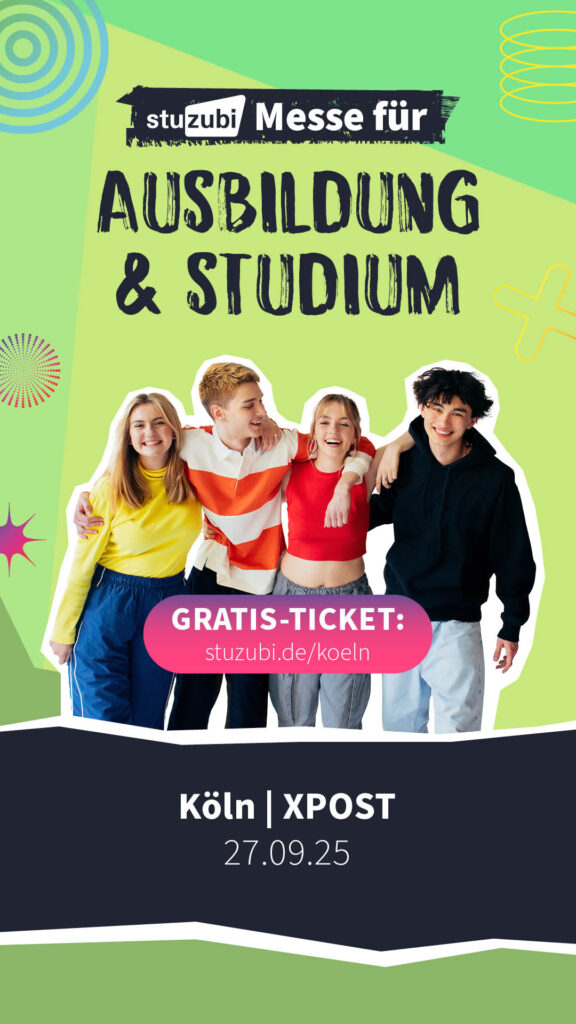 Die Stuzubi Studien- und Ausbildungsmesse Köln ist das Karriere-Highlight für junge Talente! Am 27. September 2025 von 10 bis 16 Uhr öffnet die XPOST ihre Türen für eine volle Ladung Zukunftschancen. Triff über 90 Top-Ausstellende aus Hochschulen, Unternehmen und Institutionen – entdecke Ausbildung, Studium, duale Studiengänge, Gap Year oder Auslandsmöglichkeiten. Sichere dir im Stuzubi Job SLAM in nur 3 Minuten spannende Einblicke in Arbeitgeber und Studiengänge. Nutze Live-Webinare zur optimalen Messe-Vorbereitung oder schnapp dir ein Kombi-Ticket für den Online-Event „Stuzubi Digital“ am 18.10.2025. Dein nächster Schritt in Richtung Zukunft startet hier – komplett kostenlos und mit Karrierestarthilfe!